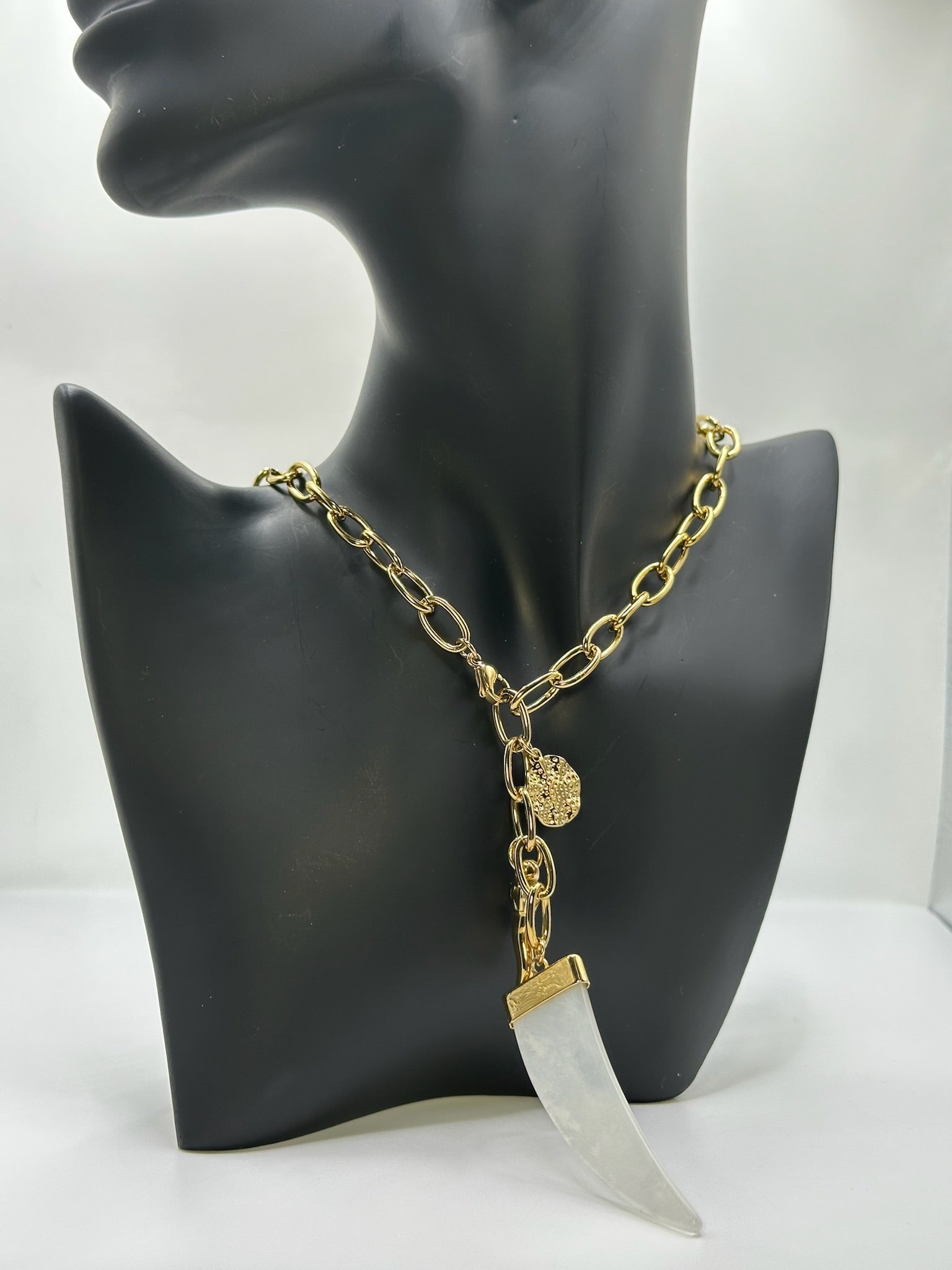 Collana chain oro con ciondolo corno in pietra bianco.